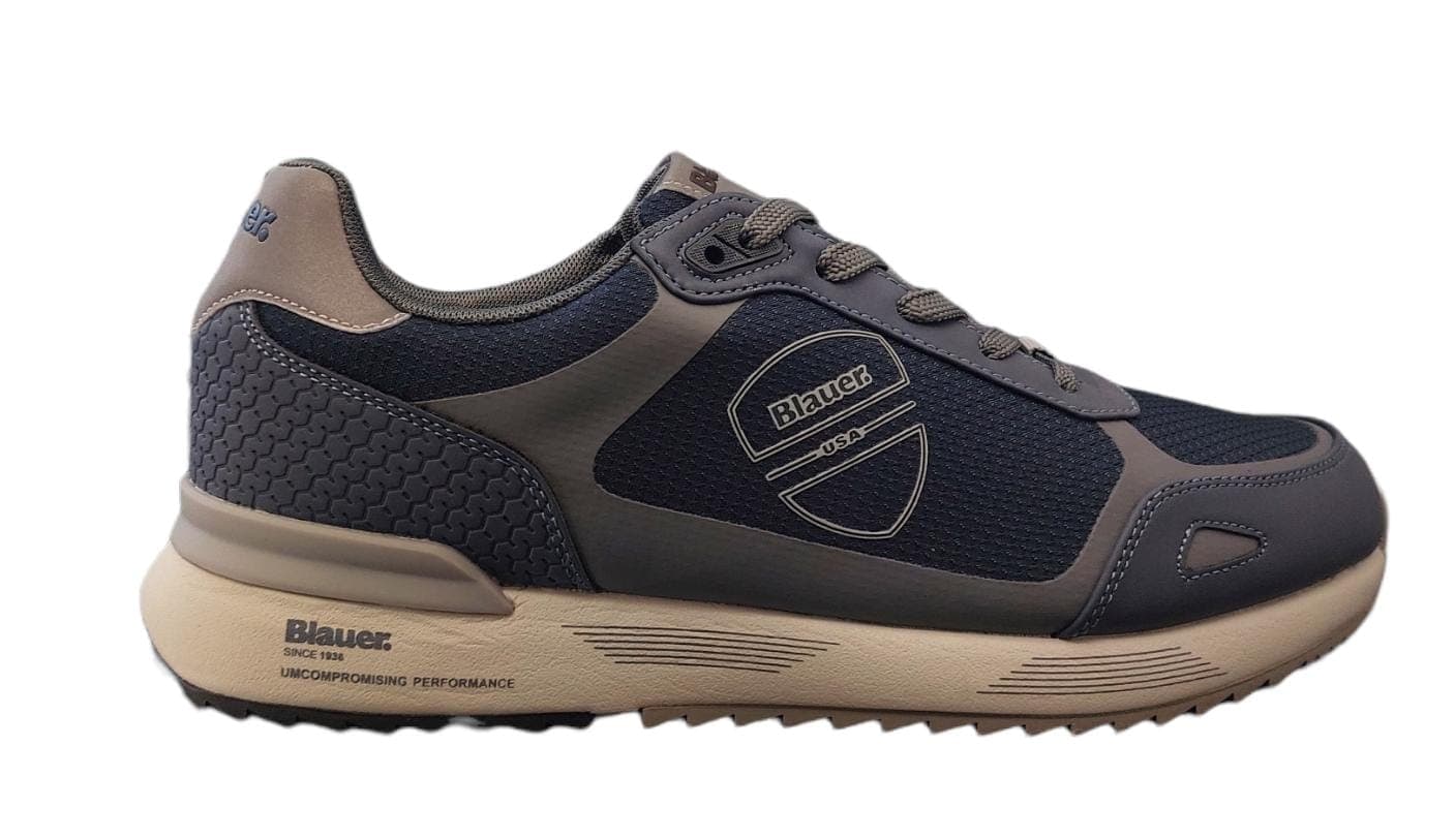 Sneaker uomo in pelle e tessuto, suola in materiale sintetico di alta qualità. Soletta anatomica in pelle di 1cm ed estraibile, per il massimo comfort. Dettaglio sul lato in metallo ed etichetta Blauer USA. Lacci in tessuto. Punta tonda