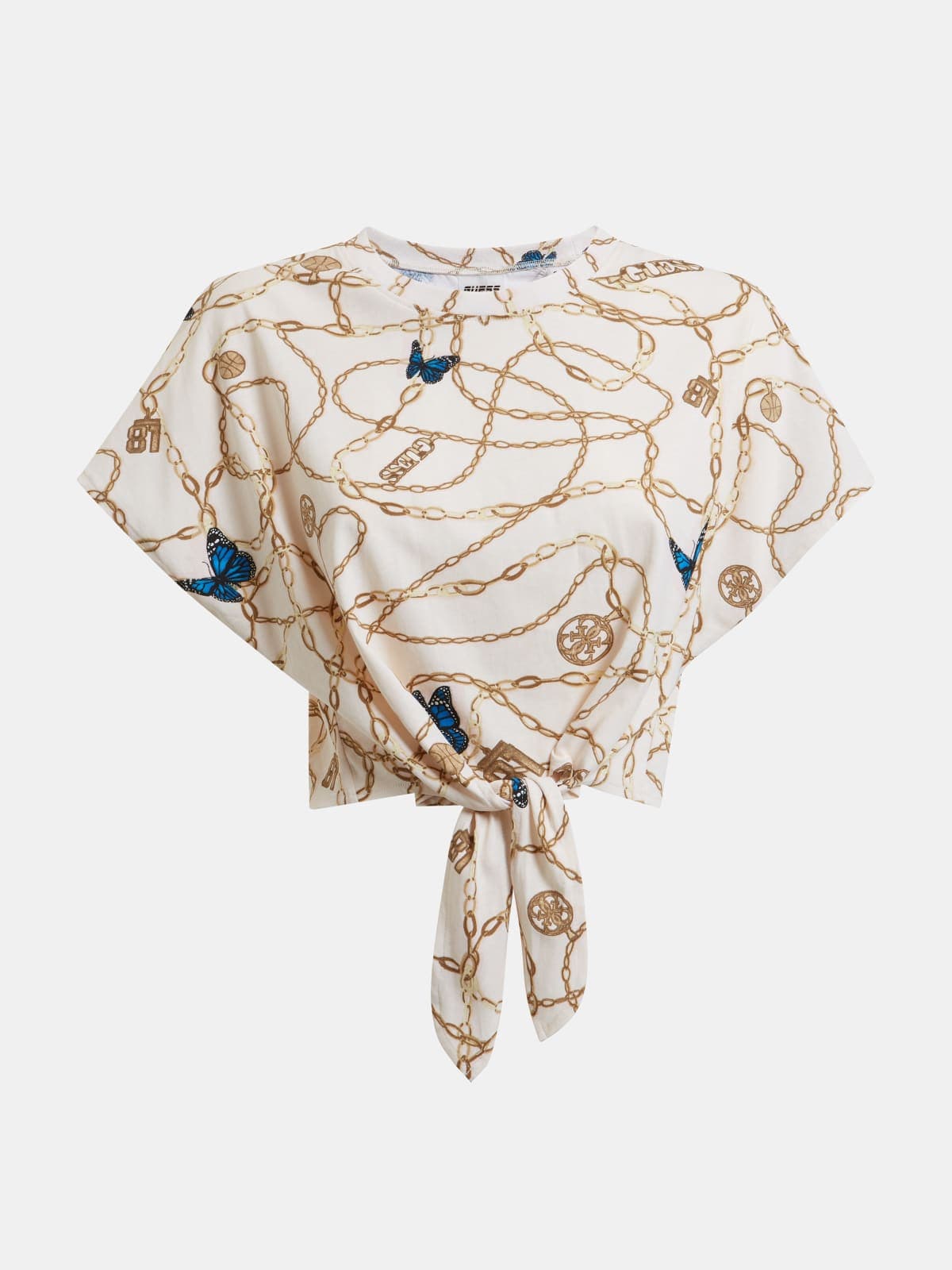 GUESS t shirt donna maglia manica corta cropped con nodo cotone beige